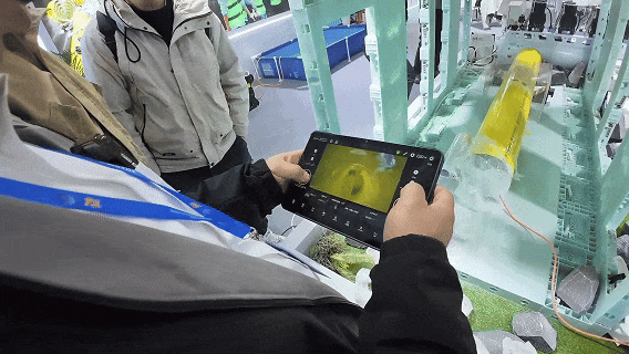 鸭嘴兽机器人和全地形机器人在水池中动态前进,以真实场景模拟高水位、高淤积工况,吸引很多有复杂场景检测需求的客户驻足了解。